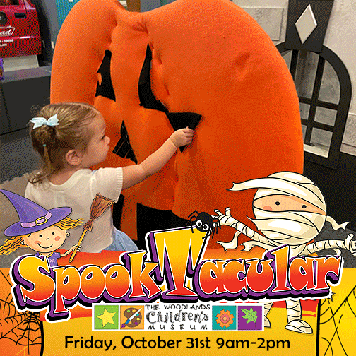 This non-spooky event will be filled with child-friendly games and activities. Live Magic shows 10:30am, 11:30am 12:30pm. Art projects and games. Monster Mash Boogie Bash at 10am & 11am.  During SpookTacular Monster Mash Boogie Bash Miss Jan will share a child-friendly “spooky” story and fun Halloween musical activities at each session. At 10:00am “Go Away, Big Green Monster!” by Ed Emberley. This classic story invites children to conquer their fears and handle their emotions through fun interaction and imagination by creating a “monster” and then making him disappear. Then at 11:00am “Spooky Spooky Spooky!” by Cathy MacLennan. This non-scary yet spine-tingling tale transports us through the dark hours of Halloween night and introduces us to some creepy creatures along the way like “horrible howling cats” and “slithery slugs.” #ToddlerMom #Art #ChildrensMuseum #TheWoodlands #WoodlandsMom #Halloeen #TheWoodlandsChildrensMuseum